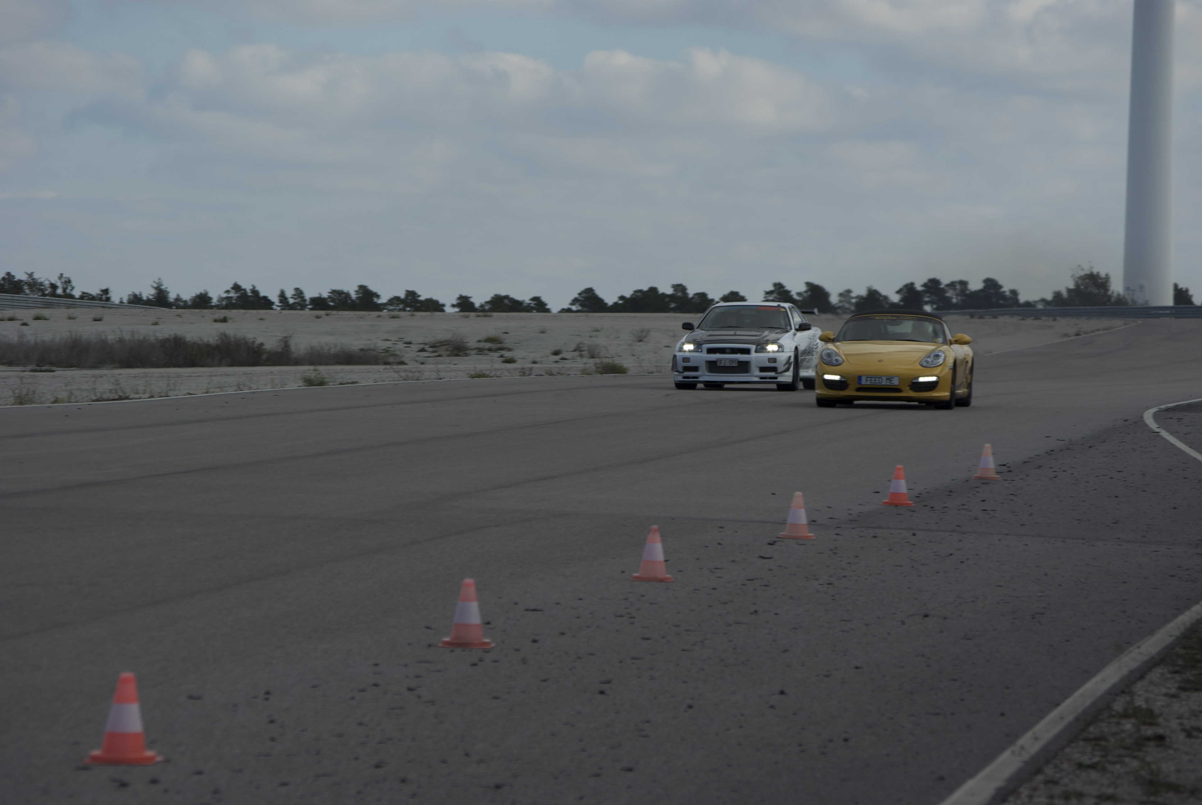Vi tar en sista bild på Skylinen strax innan den ska passera en hjälplös nyare Porsche Boxter. Är det bara jag som tycker att det där med LED-belysning kanske stigit t.o.m. de mest nobla tillverkna åt huvudet? Fy på er Porsche som oftast står för ett gediget och stilrent ”less is more” typ av formspråk och utförande på sina bilar!